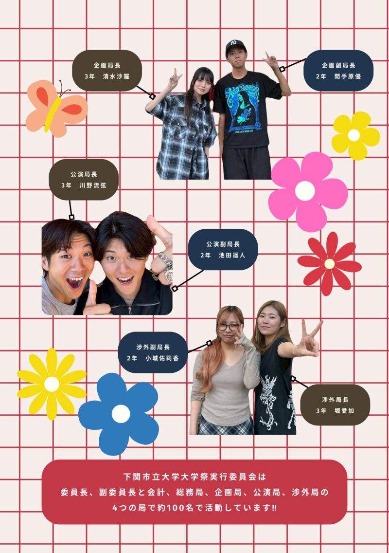 下関市立大学大学祭実行委員会は、「馬関祭」の企画・運営を中心に活動しています。12人の幹部を中心に、総務局、企画局、公演局、渉外局の4つの局に分かれており、約100人で活動しています。